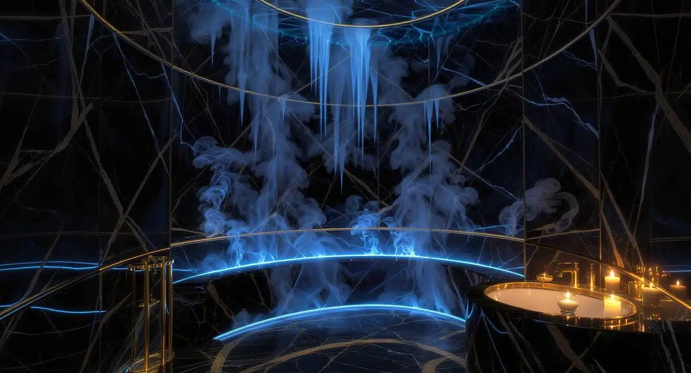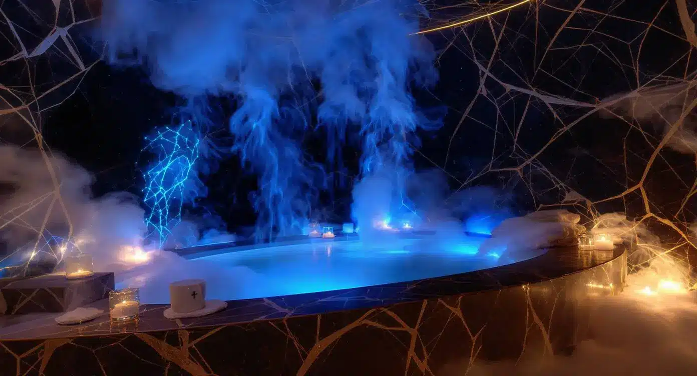 Des volutes de vapeur s’élèvent et dansent autour des lignes lumineuses bleutées, créant un spectacle hypnotique digne des plus grandes destinations bien-être au monde.