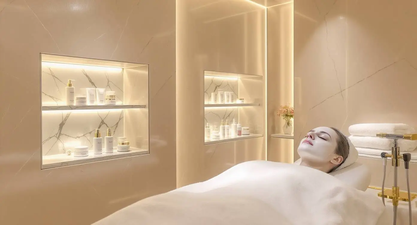 Les murs en marbre nacré diffusent une lumière douce et apaisante, tandis que les niches rétroéclairées dévoilent une sélection prestigieuse de cosmétiques professionnels. Dès l’instant où vous vous allongez, l’atmosphère se fait enveloppante, délicate… et profondément réconfortante.