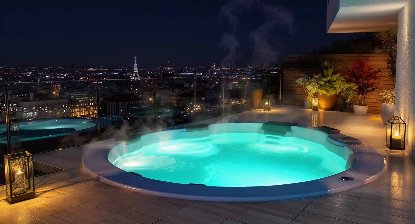 Jacuzzi extérieur privé sous lumière nocturne – Paris à vos pieds