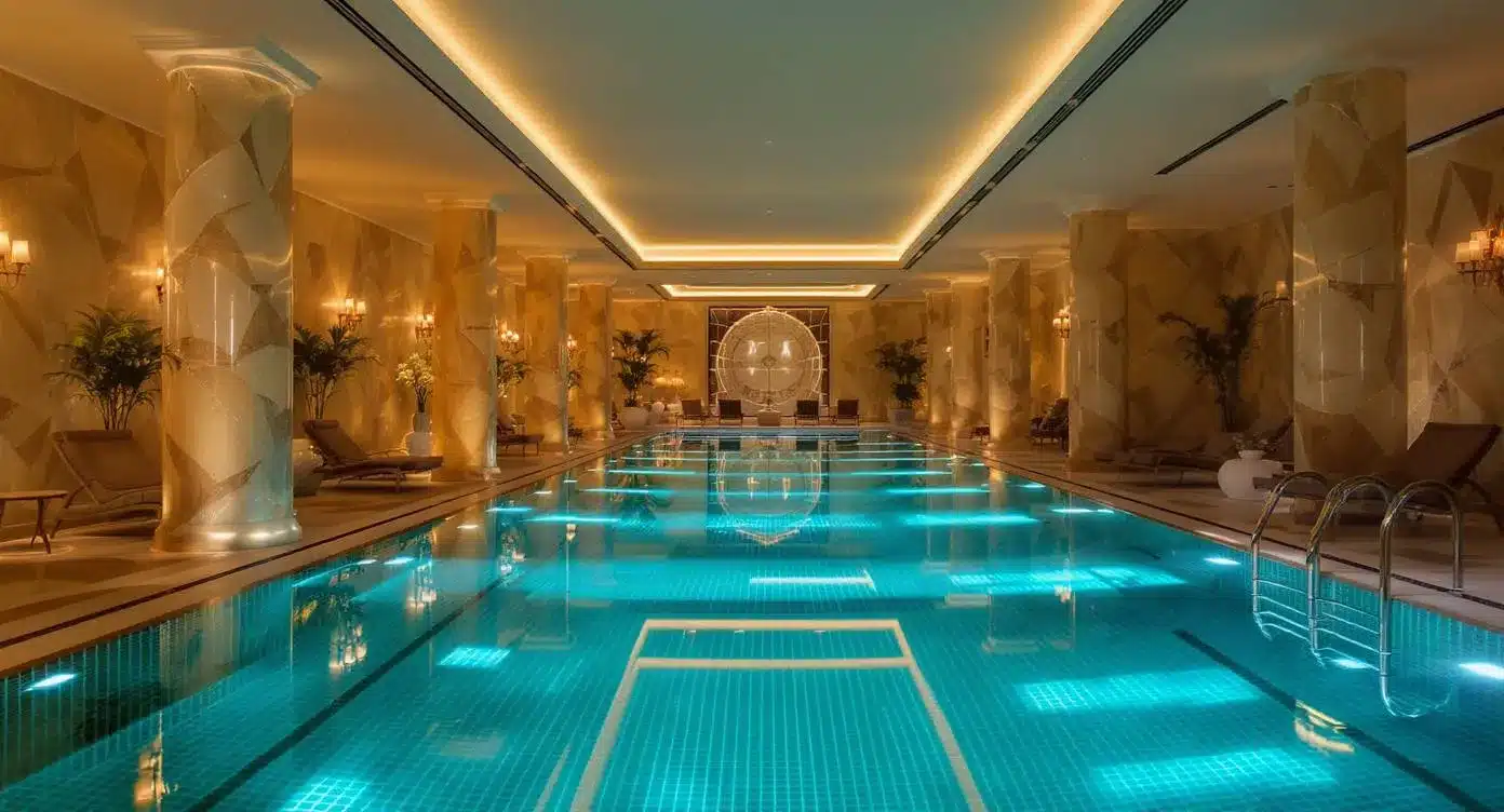 Plongez dans une piscine majestueuse, baignée d’une lumière dorée et entourée de colonnes marbrées. Ici, chaque longueur devient un moment de grâce : eau chauffée, silence absolu, atmosphère palatiale… Un espace de détente unique où luxe et sérénité se rencontrent pour une expérience inoubliable.