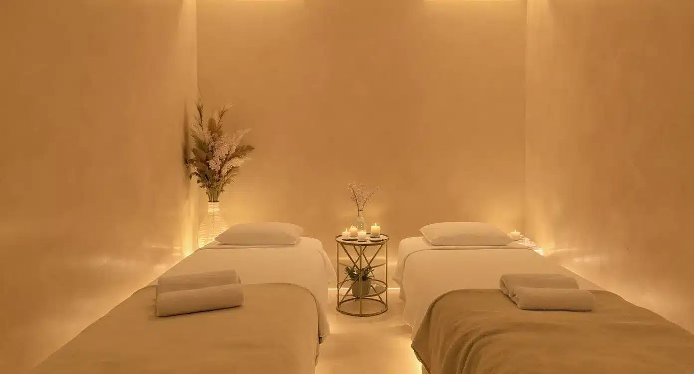 Deux lits de massage premium vous attendent, entourés de délicates bougies parfumées et d’une décoration raffinée aux teintes sable — une invitation naturelle au lâcher-prise.