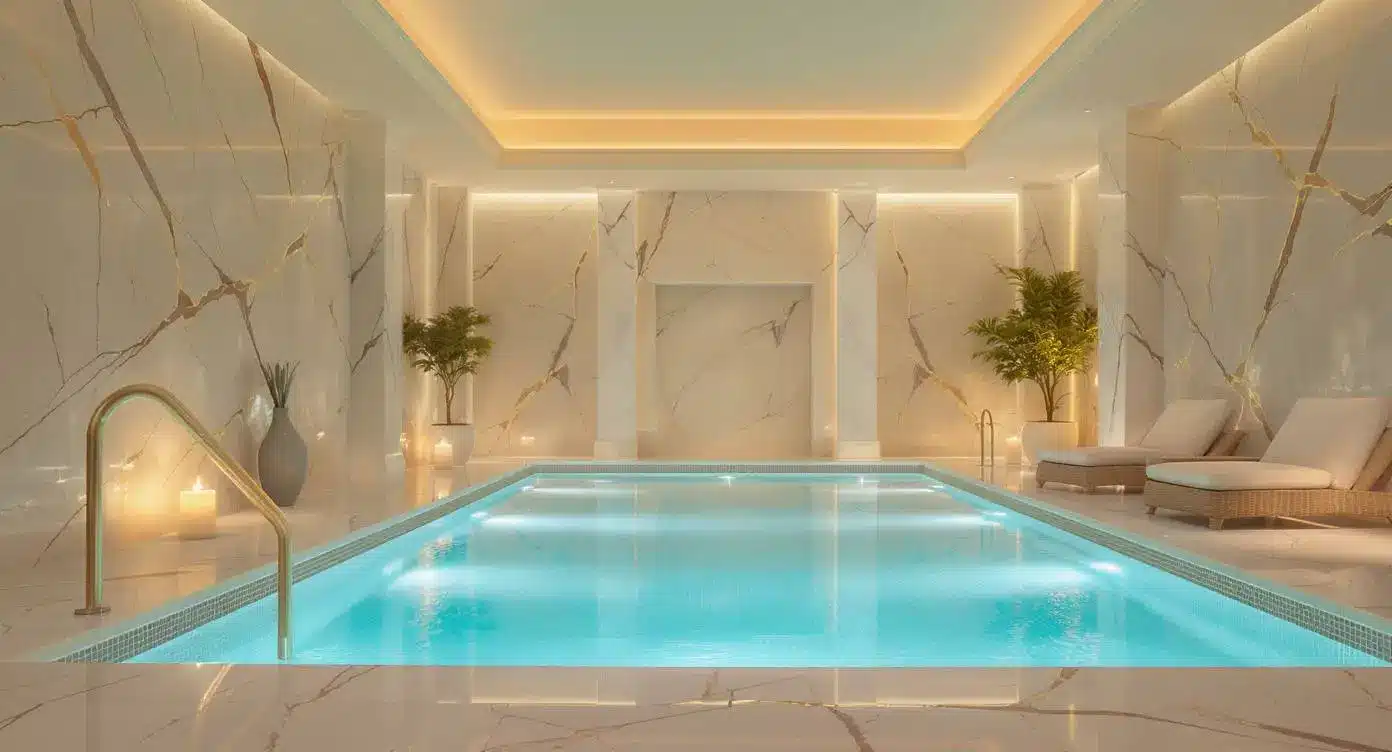 Bassin chauffant au marbre blanc – Élégance & détente absolue